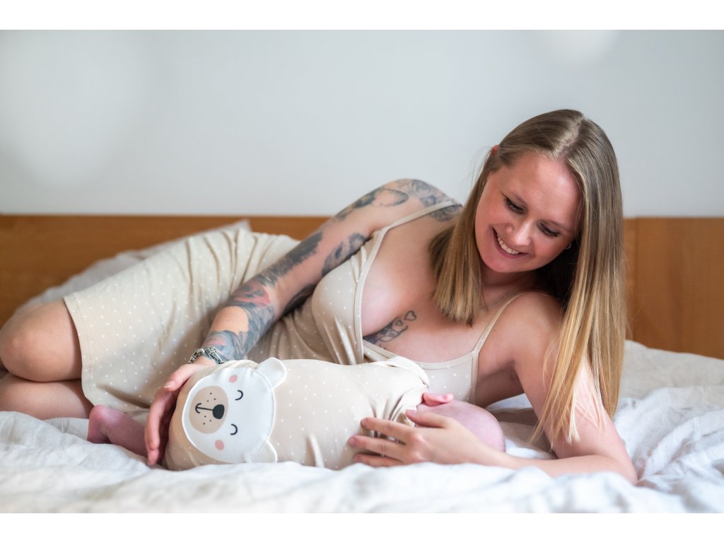 Sommer-Set für das Krankenhaus für die Mutter aus der Kollektion Dots beige enthält einen Bademantel und ein Trägerhemd zum Stillen und für die Schwangerschaft. Ziehen Sie bequeme Kleidung für die Geburt und die Wochenstation an, in der Sie sich wohlfühlen werden. Das Hemd hat verstellbare Träger und ist besonders in den warmen Frühlings- und Sommermonaten ideal.