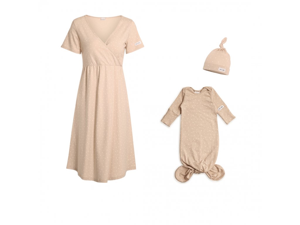 Klinik-Set für Mama und Baby Punkte Beige enthält grundlegende Kleidungsstücke, die Sie in den ersten Tagen mit Ihrem Baby verwenden werden.