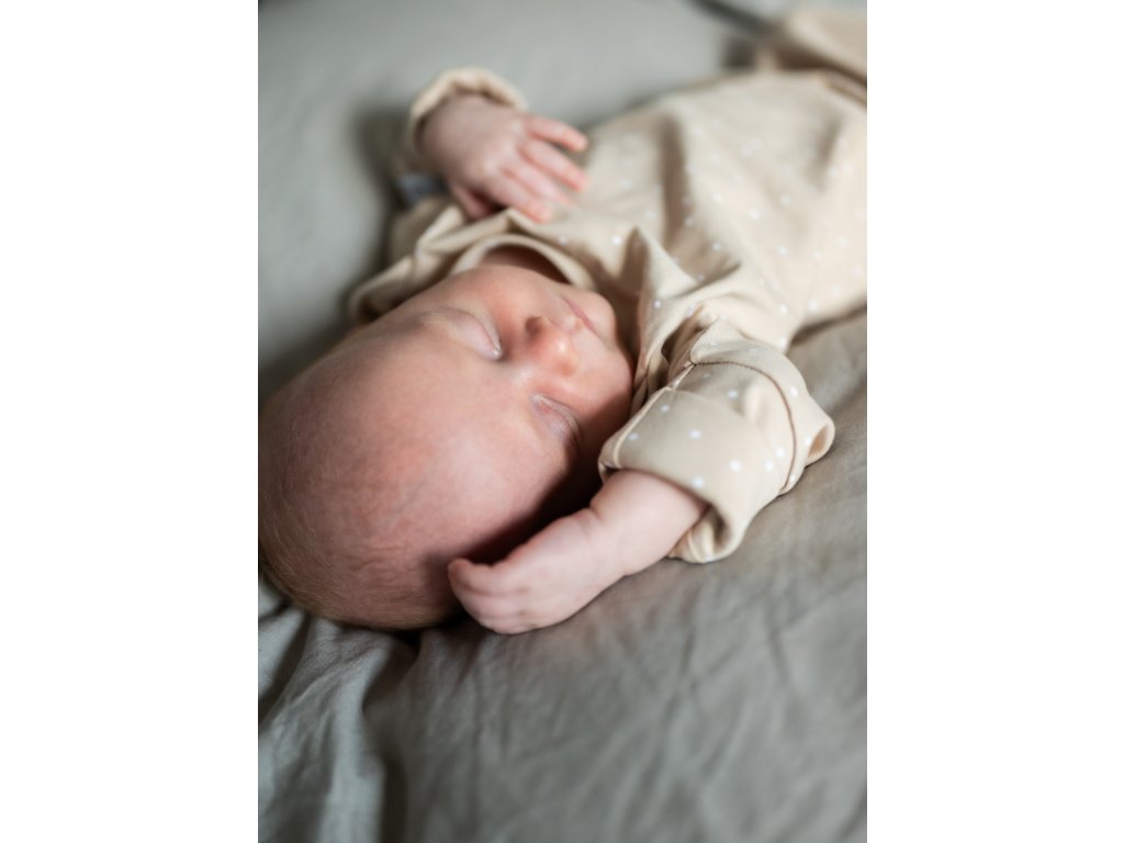 The baby has free legs in the bodysuit and can easily kick and move them as they please. This is important for the proper development of the hips. You can have the bodysuit tied with a knot or untie it and leave it completely loose. We recommend this during warm months, during breastfeeding, or tummy time.