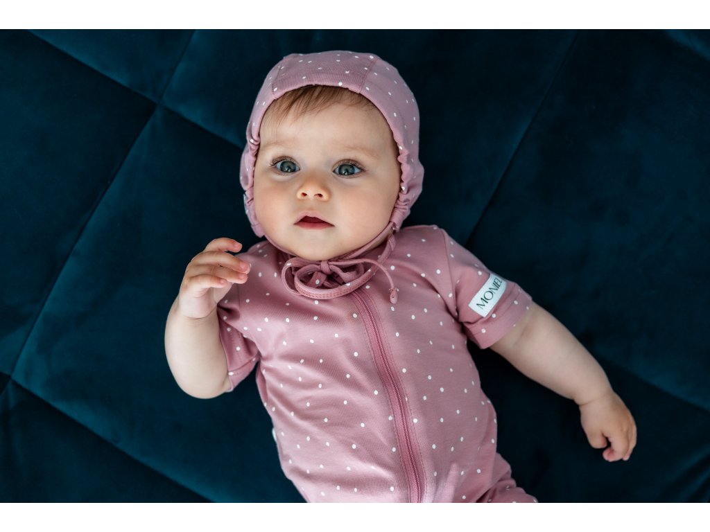 Je ručně ušitý v České Republice z přírodního materiálu příjemného na dotek. Materiál se nemačká, takže pokud nechcete, nemusíte jej žehlit. Autorský design overálku s tečkami doplňuje roztomilý obličej zvířátka na zadní straně overálku.