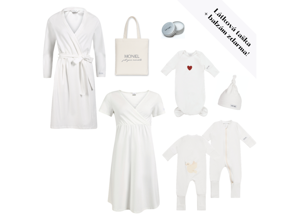 Zestaw zawiera: wygodny szlafrok, ciążową i do karmienia koszulę, rosnący dziecięcy kombinezon, body z węzłem i czapeczkę dla noworodka + torbę materiałową i balsam z masłem shea gratis.