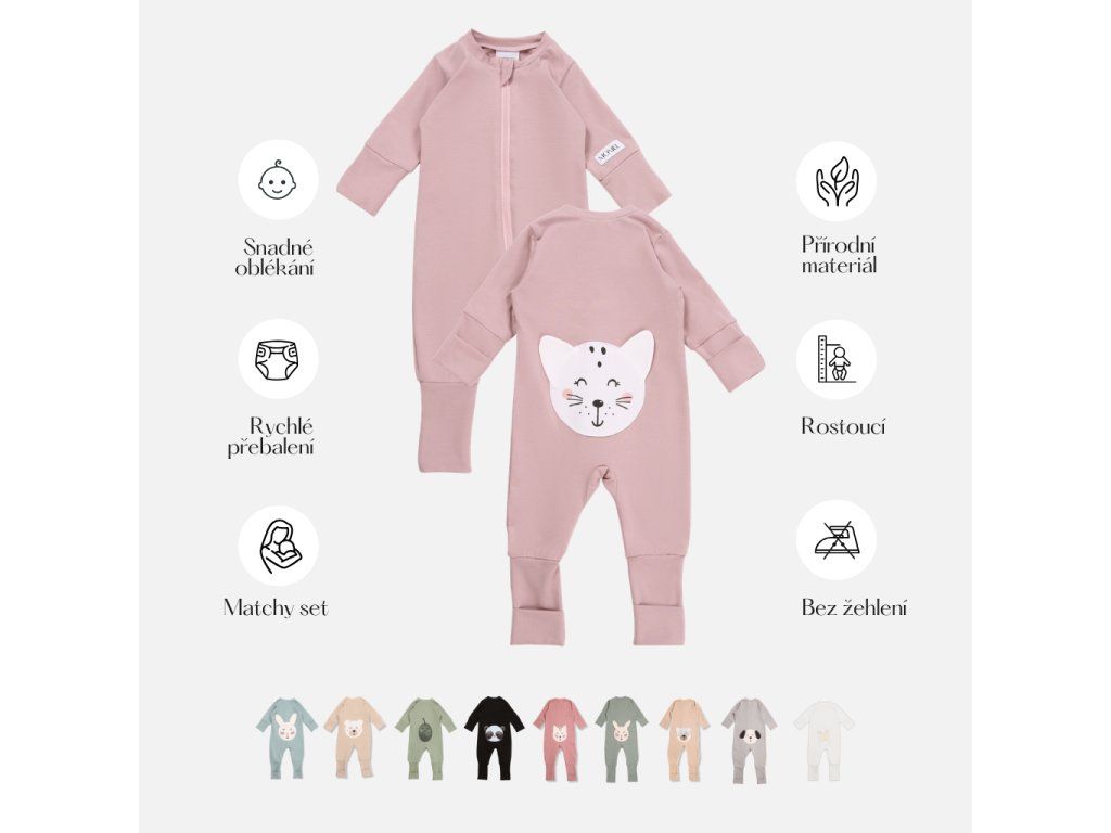 Jest szyty ręcznie w Czechach z przyjemnego w dotyku materiału naturalnego. Materiał się nie gniecie, więc jeśli nie chcesz, nie musisz go prasować. Autorski wzór pajacyka w kropki uzupełnia urocza buźka zwierzątka na plecach pajacyka.
