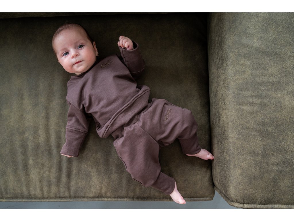 Setul de trening pentru copii Moniel Basic Chocolate este elastic și uimitor de confortabil. Copilul dumneavoastră se va simți confortabil acasă și afară. Bluza are mâneci reglabile, iar pantalonii sunt reglabili pe lungime și lățime. Produs în Cehia. Mărimi de la naștere până la 8 ani. Culoare maro închis. Mărime: 62/68 3-6 luni