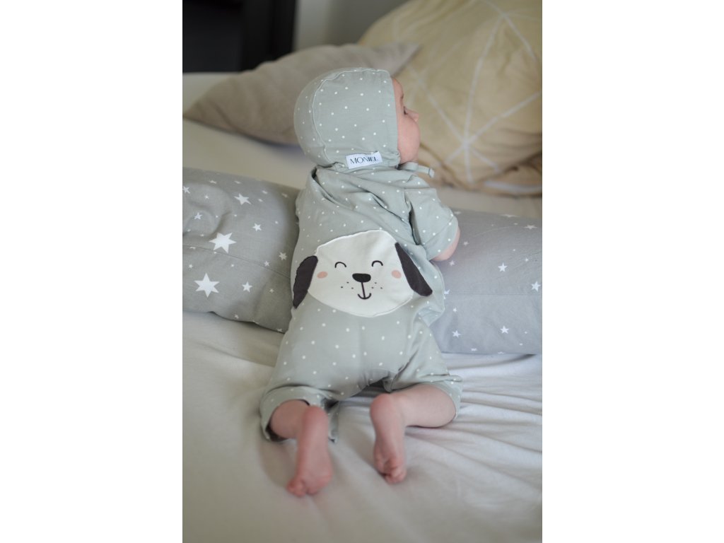 Este cusută manual în Republica Cehă din material natural plăcut la atingere. Materialul nu se șifonează, așa că dacă nu doriți, nu trebuie să o călcați. Designul original al salopetei cu buline este completat de un chip drăguț de animal pe spatele salopetei.