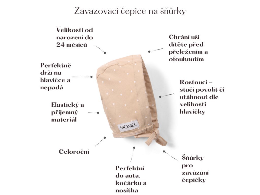 Șapca este ajustabilă datorită șnururilor de strângere, pe care le puteți slăbi sau strânge și astfel reduce sau crește dimensiunea șapcii. Acest lucru îi permite să se adapteze perfect la dimensiunea actuală a bebelușului.