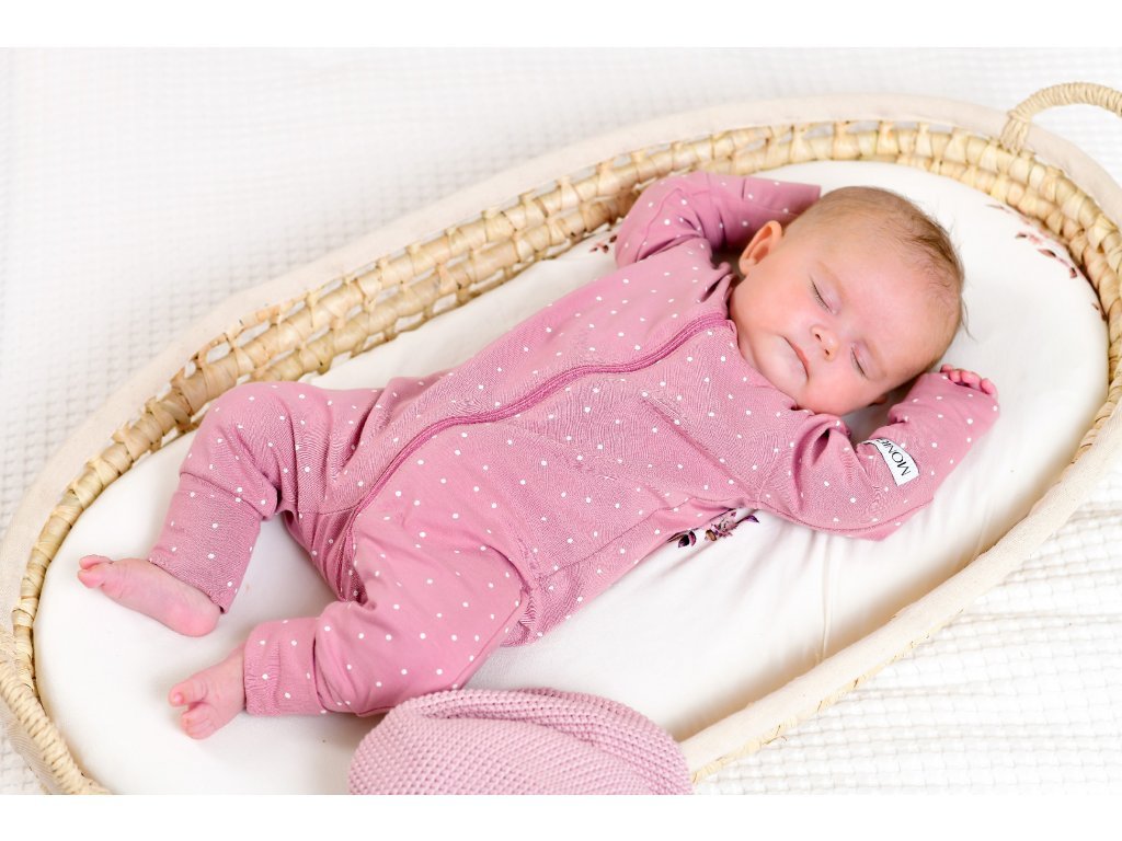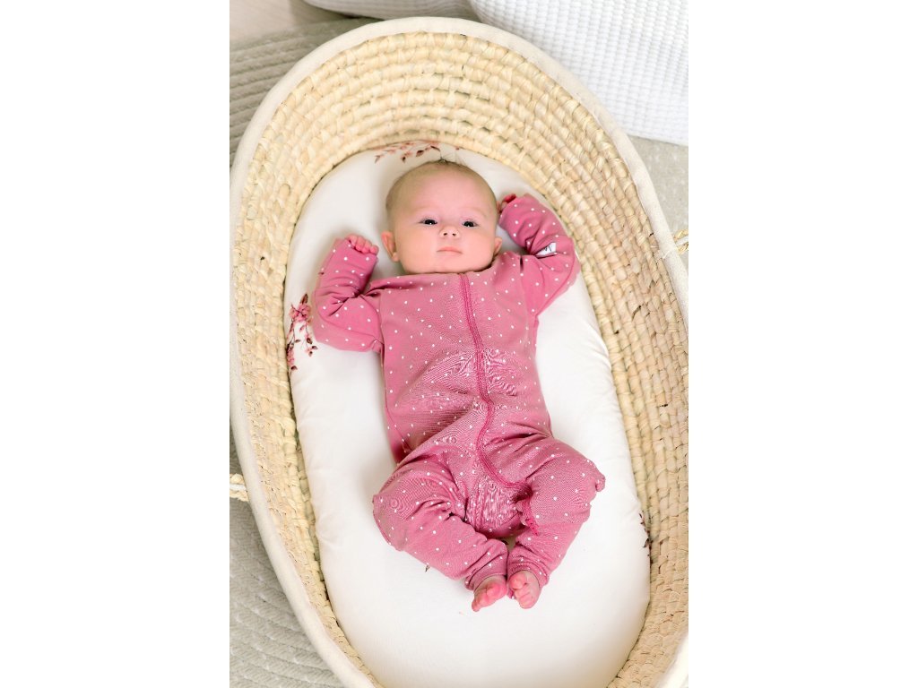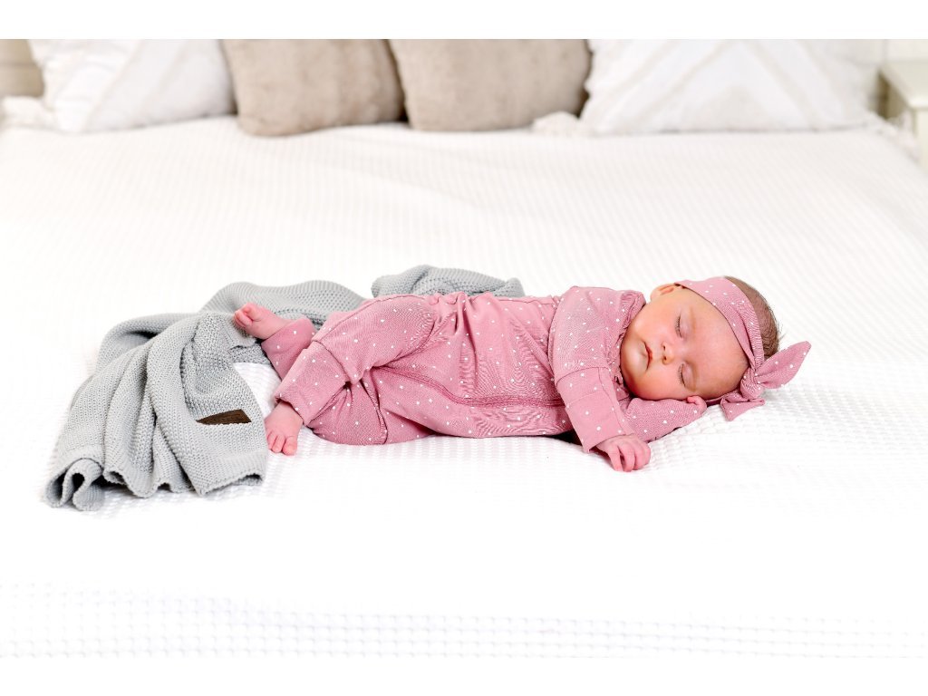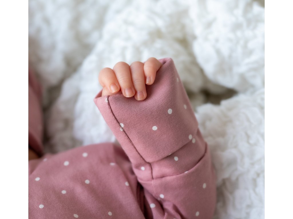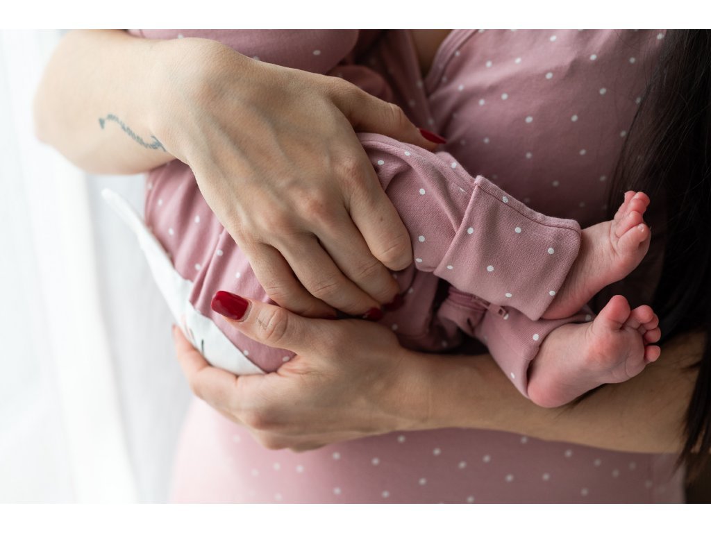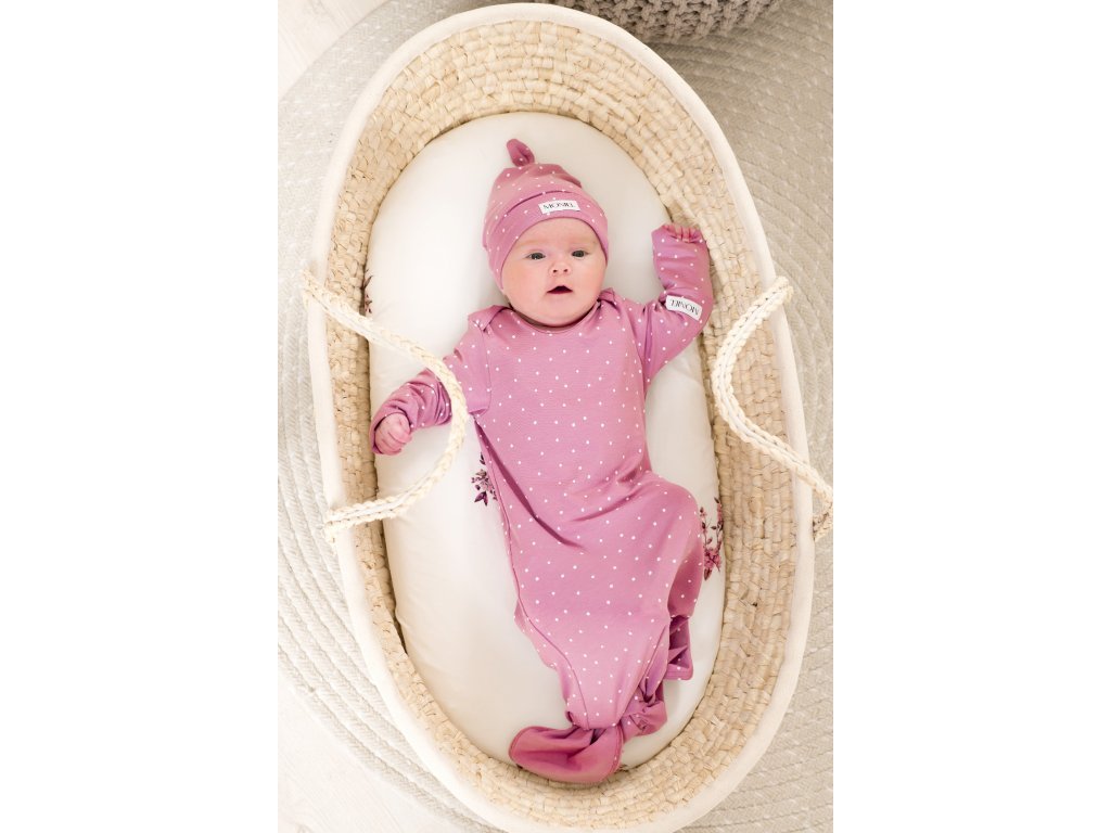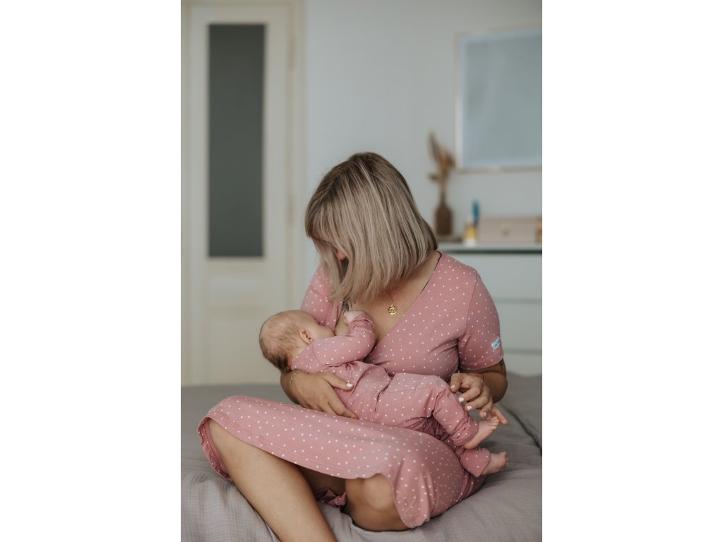 Set pentru maternitate pentru mamica și bebeluș cu buline roz conține piesele de bază de îmbrăcăminte pe care le veți folosi în primele zile cu bebelușul.