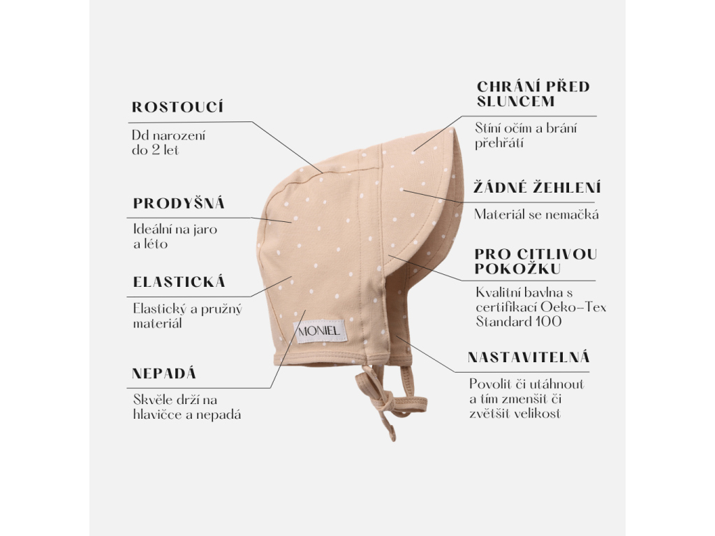 Klobúčik proti slnku je ručne šitý v Českej republike s láskou a maximálnou starostlivosťou, rovnako ako ďalšie produkty značky Moniel ♥