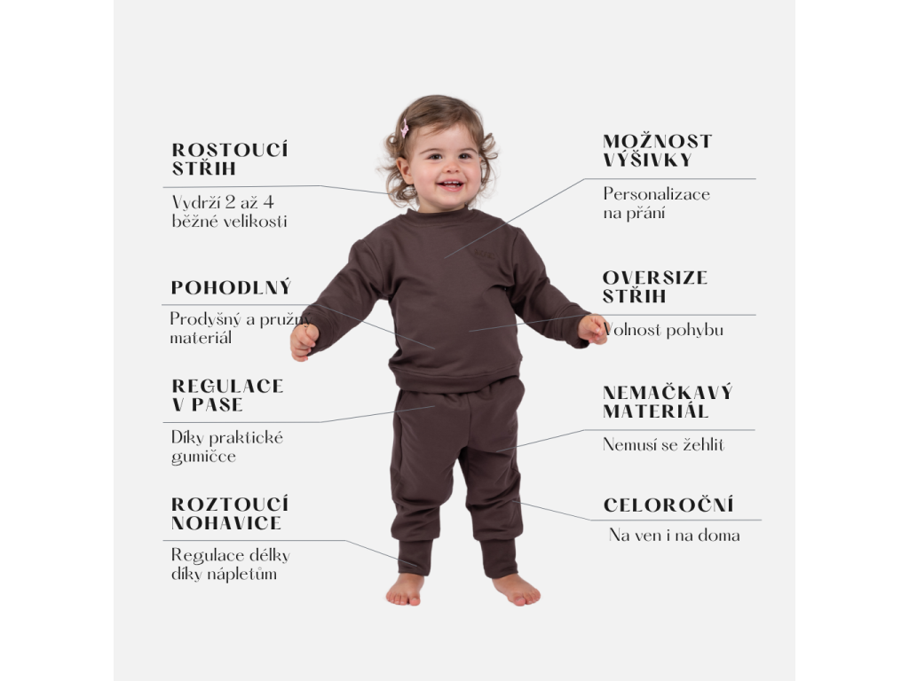 Má špeciálne náplety, ktoré sa dajú ľahko vyhrnúť alebo povoľiť a prispôsobiť aktuálnej veľkosti vášho dieťaťa. Mikina je vďaka tomu rastúca a vydrží minimálne dve bežné veľkosti.