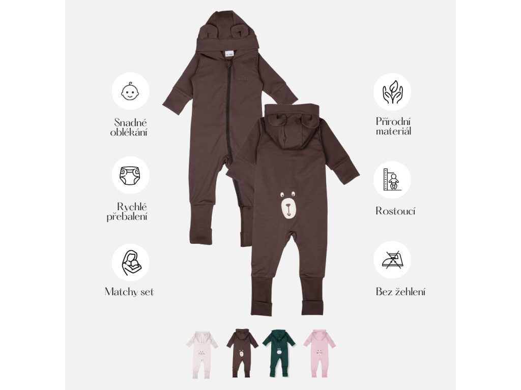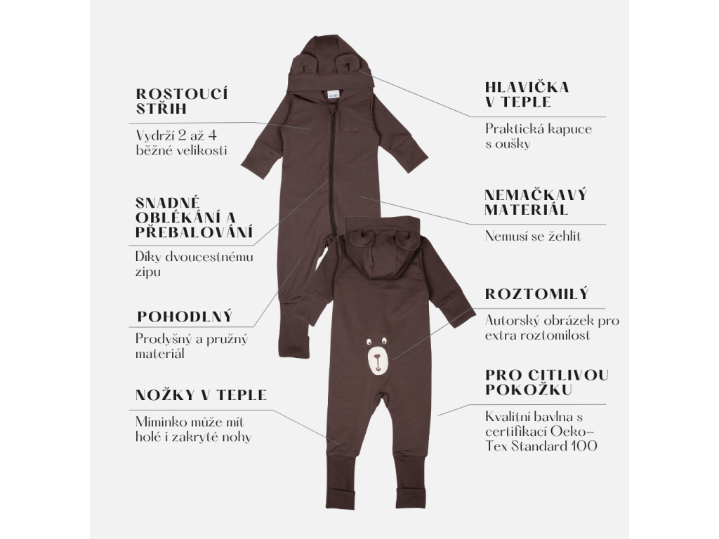 Tmavohnedá kombinéza má kapucňu s roztomilými medvedími ušami, ktorá pomôže udržať hlavičku dieťaťa v teple a zároveň dodáva kombinéze krásny dizajnový prvok.