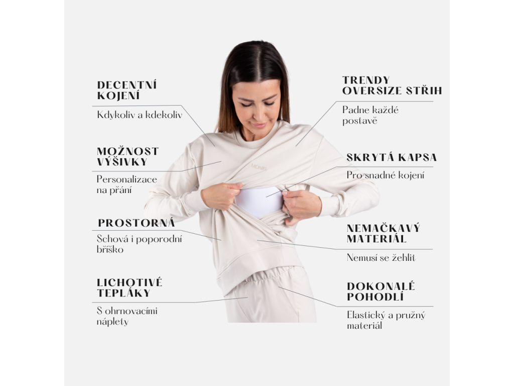 Moniel mikina bola vyvinutá v spolupráci s certifikovanými laktačnými poradkyňami, dulami a pôrodnými asistentkami.