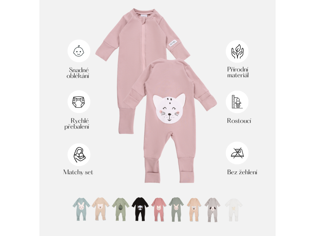 Je ručne šitá v Českej republike z prírodného materiálu, ktorý je príjemný na dotyk. Materiál sa nemačká, takže ho nemusíte žehliť, ak nechcete. Originálny dizajn kombinézy s bodkami dopĺňa roztomilá zvieracia tvár na zadnej strane kombinézy.