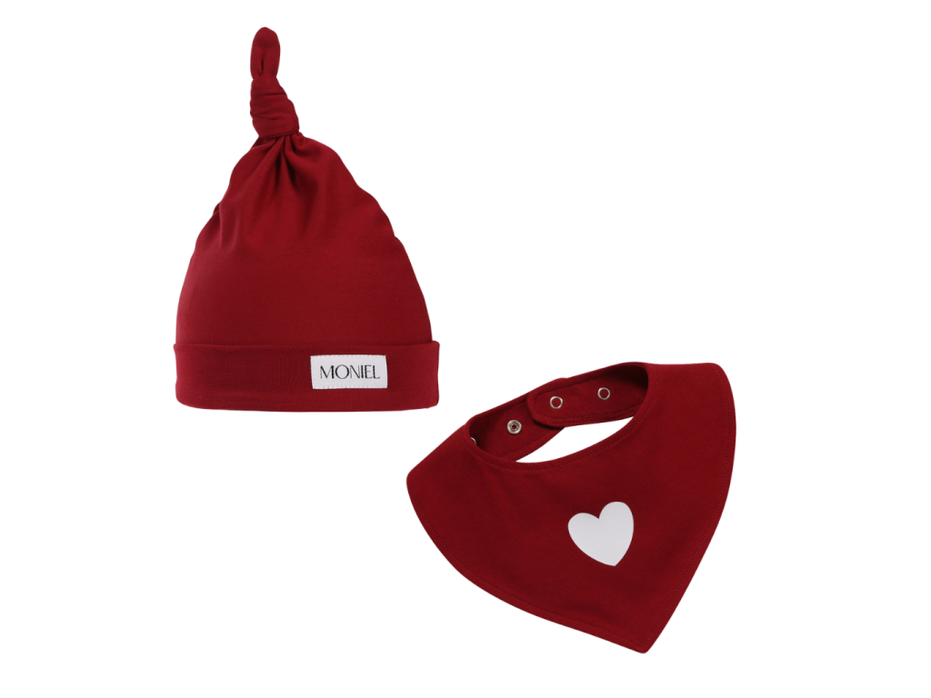 Sada k narození miminka Love červená obsahuje novorozeneckou čepičku a rostoucí slintáček, tedy dvě věci, které miminko potřebuje každý den. Díky elastickému materiálu a promyšlenému střihu produkty skvěle sedí, nepadají, neškrtí a rostou s miminkem.